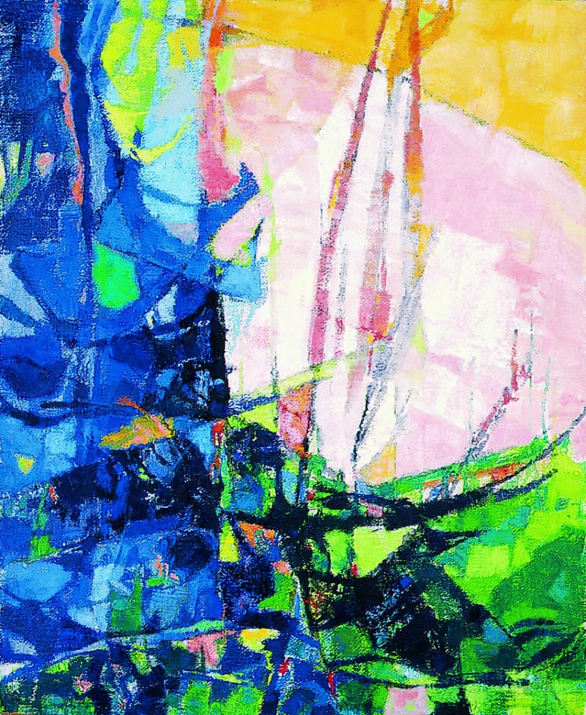 Potrebbe trattarsi dell’ultima opera alla quale Valeria ha messo mano nel corso del 1992. Sembra un’opera non del tutto finita; a riprova, il fatto che non è firmata. Il soggetto è comunque affascinante, anche se mi pare già praticato/presente in almeno un altro lavoro; si tratta secondo me di un albero che contorna/scontorna una finestra di luce accecante segnata/solcata da una verticale di non chiara riconducibilità figurale. Consueta la tripartizione di toni cromatici: in questo caso blu, verdi e rosa lattiginoso.