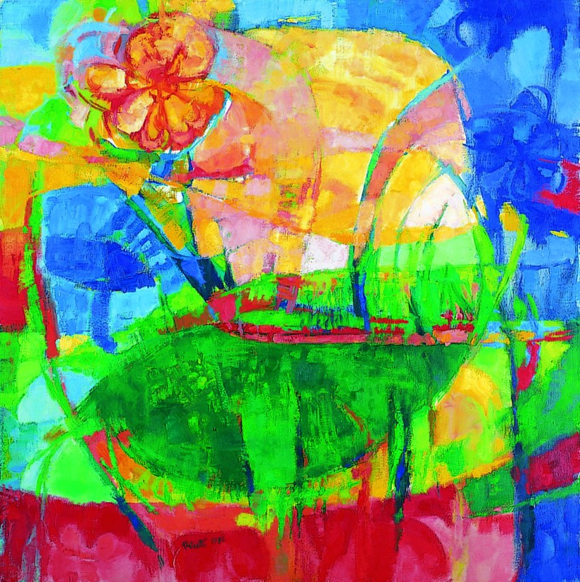 È chiaramente un paesaggio costruito su una emanazione di movimenti circolari sottolineati da linee verdi ed arricchito dalla presenza di motivi floreali/decorativi di sapore simbologico-architettonico (che mi sembrano voler ricordare i rosoni/frontoni delle migliori cattedrali romaniche italiane: se ne leggono chiaramente almeno due). Merita l’esposizione.