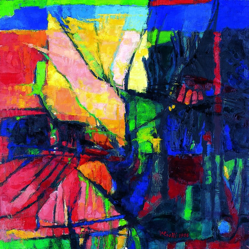 Opera a mio avviso davvero interessante, ben risolta sul piano pittorico. Dico questo in ragione della «giustapposizione»/«compenetrazione» dei piani/nuclei cromatici e dalle luci interne che affiorano e quasi «sorridono»/ «guardano» come fossero occhi dalla penombra dei toni scuri (blu, amaranti, e neri); e dei trilli, abbellimenti di certo, dei tratti delicati delle nervature/colature. Difficile avvicinarsi all’ipotesi di identificazione del soggetto: quella più probabile mi sembra comunque rimanere «il paesaggio». È opera quasi sicuramente da mostra.