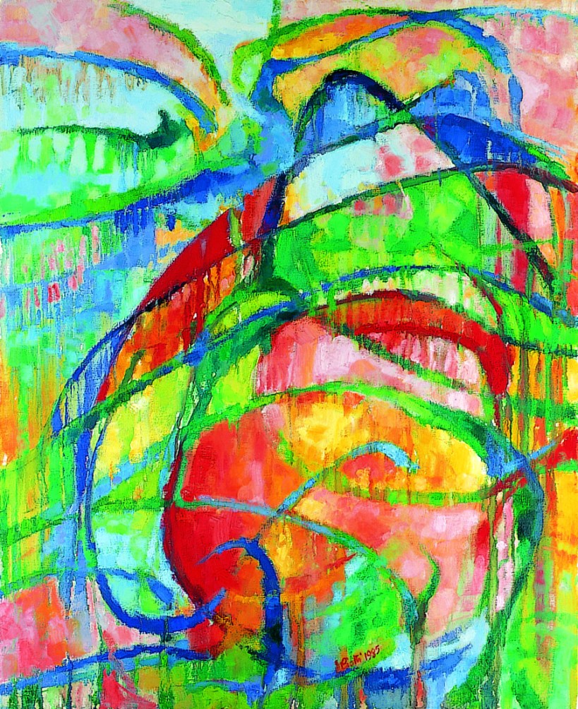 Qui la pittura diventa colante, grondante, quasi a voler indicare un’atmosfera ventosa in una giornata di pioggia. Forse proprio per questa ragione l’aria non si solleva, la forma compositiva del quadro non si apre, ed i segni sembrano avvilupparsi su loro stessi. Non per questo l’opera risulta irrisolta: tutt’altro. Si percepisce come una corrente di vento da sinistra verso destra che gli infonde un energico movimento, generatore di una sorta di vortice contrappuntato tra l’alto e il basso del lavoro. Il cromatismo è più forte e acceso che nei tre lavori precedentemente esaminati (verdi, rossi e blu dominanti ed intensi). Mi pare ancora un’opera da mostra, utile a comprendere il lavoro di Valeria in tutte le sue sfaccettature emozionali e stilistiche.