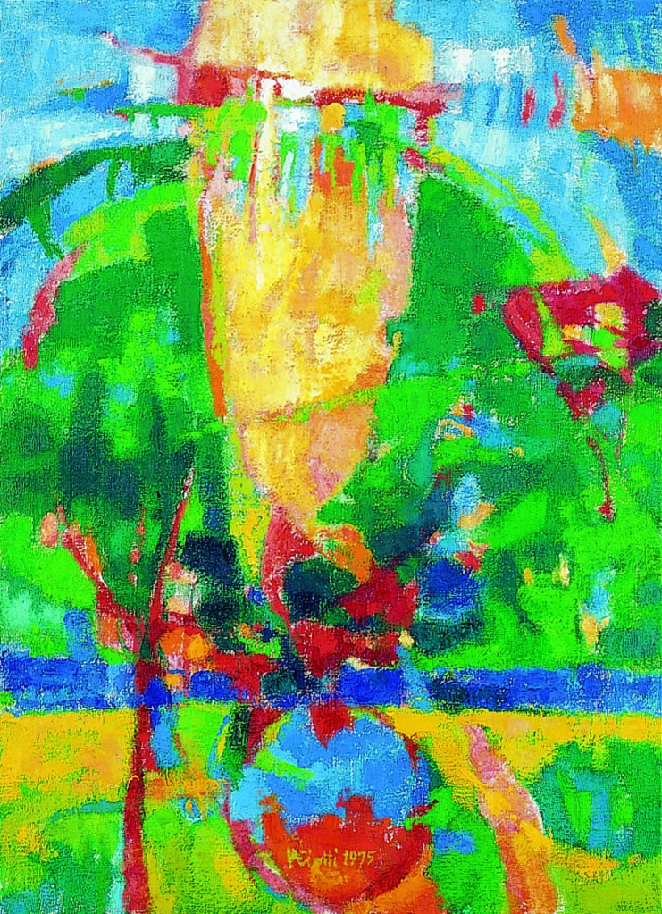 Mi pare che si ripresenti, come già in altri lavori, il soggetto di una imbarcazione a vela che procede di bolina, vista frontalmente. Potrebbe confermare tale ipotesi la riflessione della sagoma di una chiglia nella parte bassa, in cui sono inserite firma e data. È una festa di verdi, erosa/lampeggiata da tocchi di rosso, che intervengono proprio nei punti chiave a confondere l’identificazione del possibile/presunto soggetto (in grande campitura gialla). Il pezzo è da catalogo.