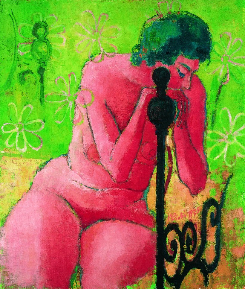 Quello che colpisce non è tanto l’aspetto plastico e anatomico del soggetto, che peraltro esiste, quanto il bilanciamento dei campi/piani tonali (l’acceso dell’incarnato con il dualismo sfumato dello sfondo di ocra-giallo e verde) ed il senso di sospensione/riflessione – al limite dell’irreale – che deriva dalla fluttuazione del motivo floreale, che si stacca dalla parete/tapisserie e galleggia nell’aria, e dalla fuga della struttura del letto/canapé, sguinciato sul lato destro per poi vederlo comparire dallo sfondo sul lato sinistro.