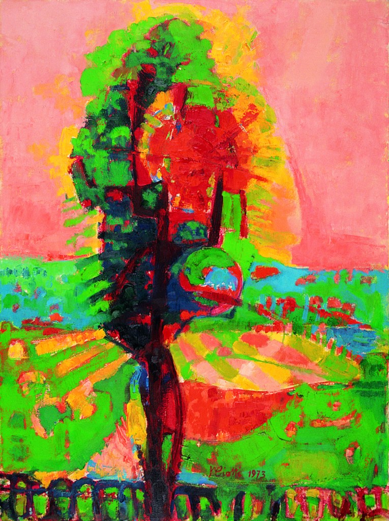 Opera strana ed enigmatica, per la contorsione del tronco e lo stridore cromatico, surreale, che invade l’opera: il rosa del cielo contrapposto al blu delle colline, con il buco vermiglio/carminio del sole che perfora le fronde dell’albero.