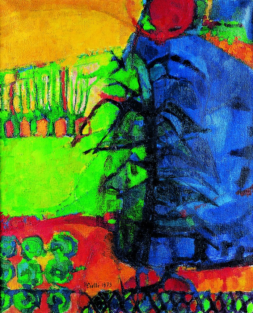Il soggetto/tema è ancora una volta, chiaramente, l’albero, questa volta blu scuro (prussia/quasi nero), un albero che volge verso una scarnificazione metamorfica di sentore sutherlandiano e che segna/struttura l’opera per quasi tutta la sua verticale, coronato nella parte superiore da una sfera infuocata (il sole?): tale verticale evidenzia una grande macchia blu, sotto di sé e sul proprio lato destro fronte quadro.