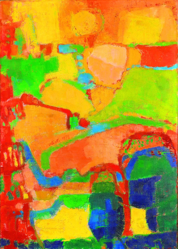 Questo lavoro mi sembra comunque collocarsi all’interno di/accanto ad una serie di lavori (v. Festa d’estate, |Oli•053|, «Monoliti» |Oli•055|, Vigneti sotto la neve a Ramàts, |Oli•058|) del ‘72 nei quali Valeria ha cercato a mio avviso di scandagliare le possibili valenze lirico-astratte del motivo/tema paesaggio in alcune sue forme e momenti di luce, cercandone i diversi esiti emozionali.