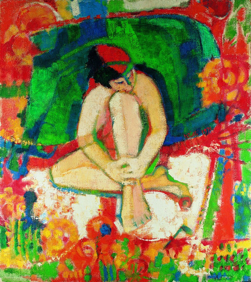 È un nudo decisamente particolare, pittoricamente complesso e ben risolto, anche se caratterizzato da evidenti debiti con le lezioni di Gauguin e di Matisse; la figura femminile è avvolta/fasciata (il torso) in una campitura di verdi-blu ed è tuffata per le restanti parti del corpo, seduto, in una trama di segni e di tocchi cromatici che sembrano ricordare gli effetti di un tappeto.