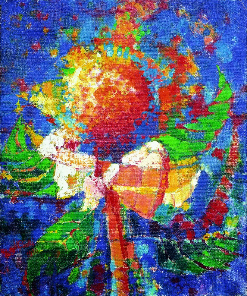 La struttura del quadro è tutta un’infruttescenza, delicatamente/elegantemente tenuta insieme/strutturata dai campi texturizzati delle foglie e dall’iridescenza/riflesso che si irradia orizzontalmente prima e circolarmente poi dal vertice dello stelo, anch’esso reso dalla luminosità del cromatismo rosso/arancio impiegato, quasi trasparente.