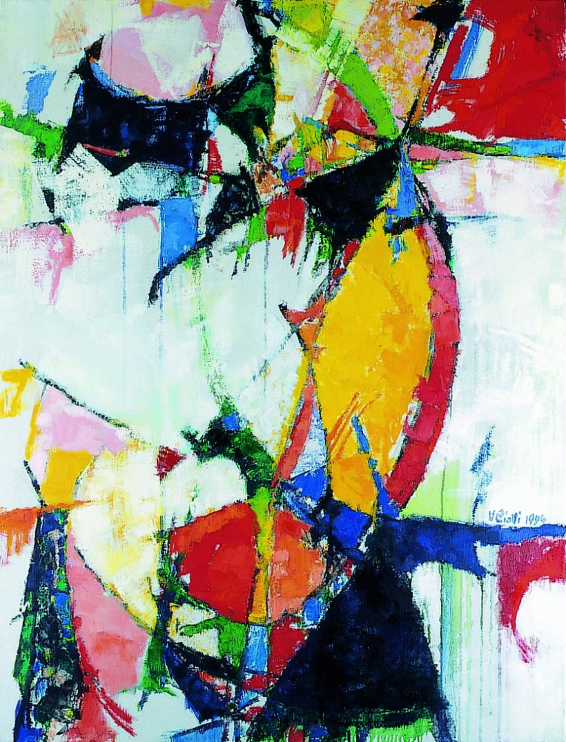 Come nella tela «Composizione n 1» (|Oli•157|) le linee si muovono, le curve si incrociano e un’ipotetica forma/figura ovale sembra scomporsi o dilatarsi in una serie di riflessi/trasparenze che la muovono ed agitano sul piano. Anche la tavolozza sta cambiando: i toni accesi si alternano al campo bianco/ghiaccio, quasi un sudario/velario di non memoria e [...]